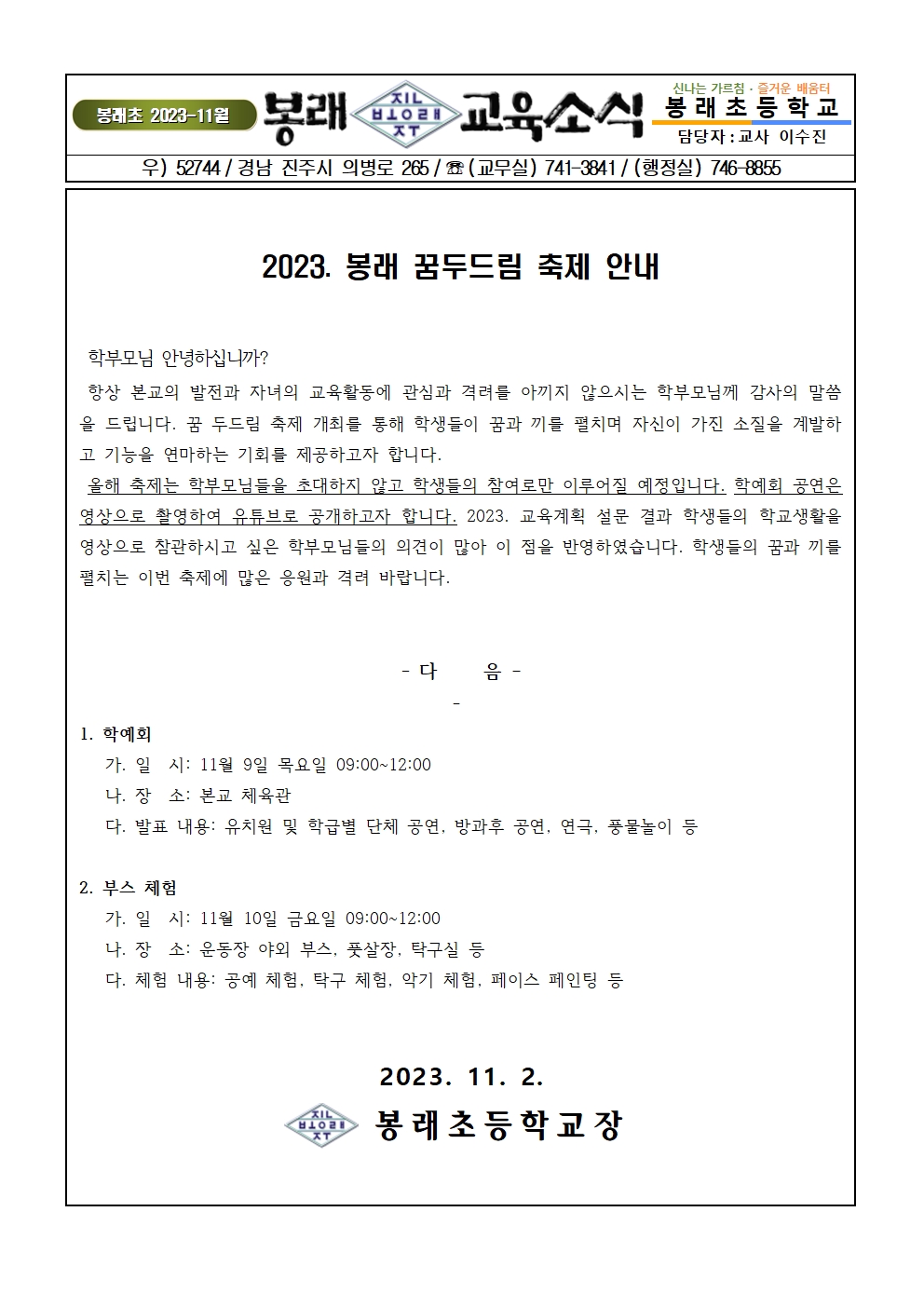 2023. 봉래 꿈두드림 축제 가정통신문.hwp