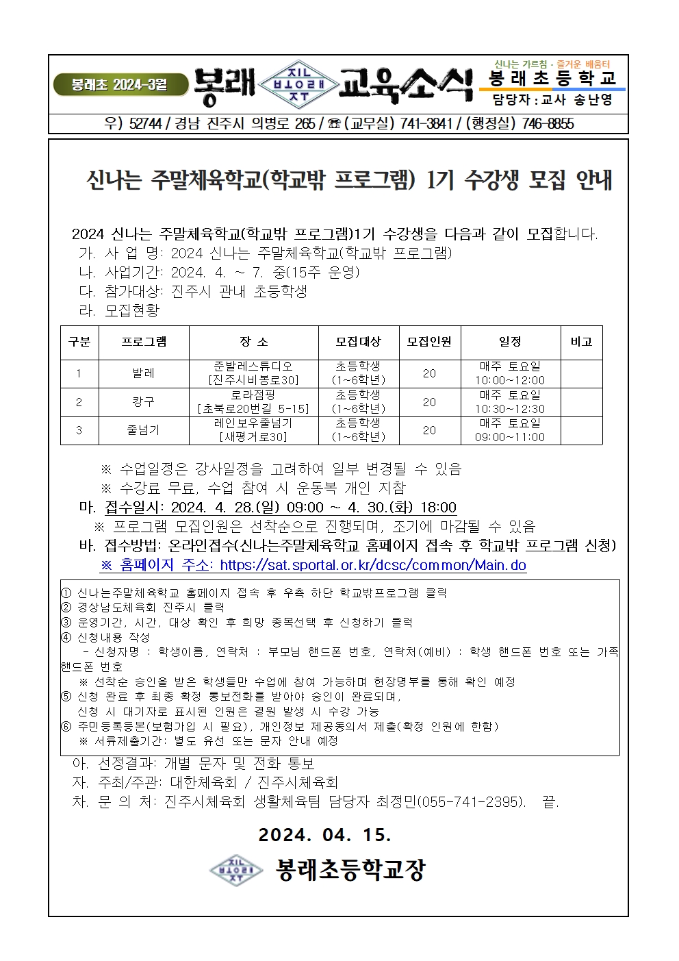 2024. 신나는 주말체육학교(학교밖 프로그램) 1기 수강생 모집.hwp